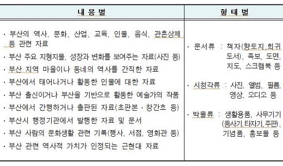 세부적으로 ▲부산의 주요 지형지물 ▲성장과 변화를 보여주는 사진 ▲부산지역 마을 또는 동네의 역사를 간직한 자료 ▲부산 출신이거나 부산을 기반으로 활동한 예술가의 작품 ▲부산 사람의 문화생활 관련 기록 등 역사적 가치가 인정되는 근현대 자료다.