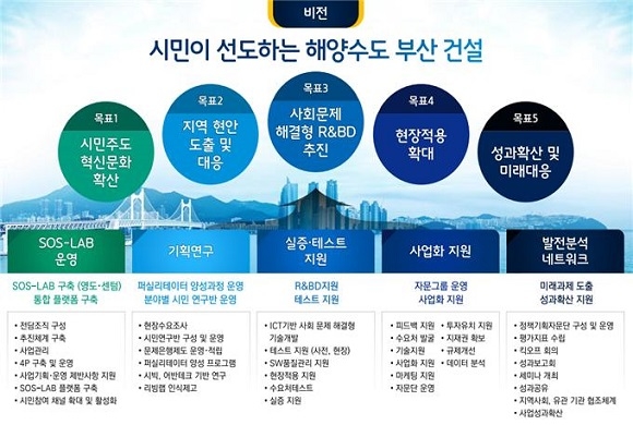 이를 통해 시의 당면한 문제인 해양분야 사회문제를 해결하기 위한 사회 문제해결 실험실 구축과 문제 발굴, 해결 SW 서비스 구현 등 R&D 기획부터 실증까지 전 과정을 수행한다. 특히 리빙랩 및 민-관-산-학-연과 혁신 네트워크를 구축해 융합·교류를 촉진, 파급력을 확대한다는 계획이다.