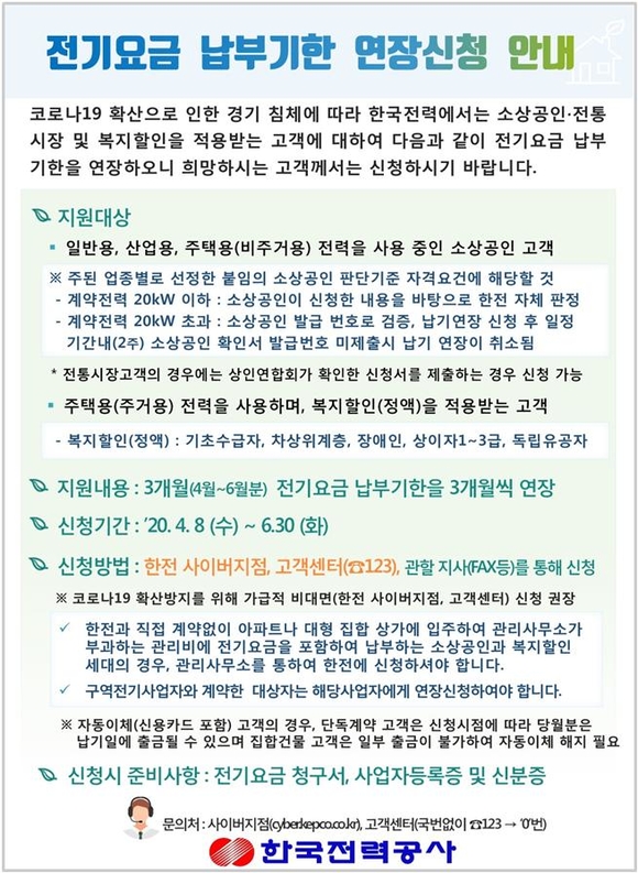 신청은 한전 홈페이지나 콜센터 등을 통해 가능하며, 코로나19 확산방지를 위해 가급적 비대면 신청을 권장하고 있다.