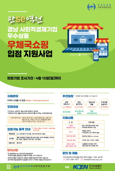 이에 모두의경제사회적협동조합은 네트워크 및 역량을 활용해 이번 사업을 홍보하고, 한국우편사업진흥원에 경남 사회적경제기업의 정보제공 및 우수상품 추천으로 경남 사회적경제기업의 온라인 판로개척을 지원한다.