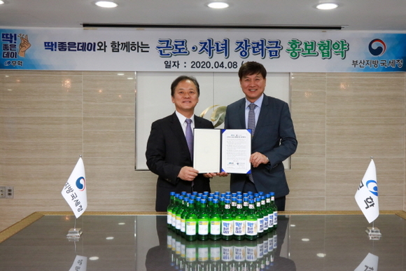 무학은 8일 경남 창원시 무학 본사에서 ‘딱! 좋은데이와 함께하는 근로·자녀 장려금 홍보협약식’을 갖고 부산지방국세청과 근로·자녀 장려금 홍보를 위한 업무협약을 체결했다.