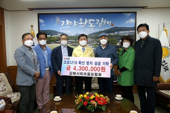 김해시파크골프협회는 7일 코로나19 장기화로 힘든 시민을 위해 사용해 달라며 성금 430만원을 김해시에 기탁해 '코로나19 기부릴레이'에 동참했다.