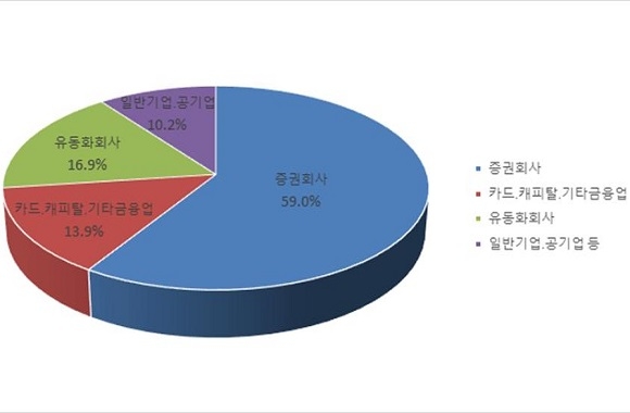 업종별로는 증권회사가 172조 9000억원으로 가장 많았으며 이어 유동화회사 49조 7000억원, 카드·캐피탈·기타 금융업 40조 8000억원, 일반기업·공기업 등이 29조 8000억원 순으로 많았다.
