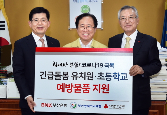 부산은행에 따르면 지역 유치원, 초등학교의 안전한 긴급 돌봄을 지원하기 위해 방역물품을 부산사회복지공동모금회를 통해 시교육청에 기탁했다.