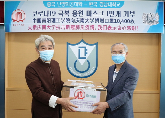 난양이공대학교는 코로나19로 인한 중국 유학생과 외국 유학생의 격리 기간 중 유학생들의 건강을 위해 보살핌과 지원을 아끼지 않은 경남대에 보답하고자 마스크를 기부했다. 마스크는 세관의 통관절차를 거쳐 13일 오전 경남대에 도착했다.