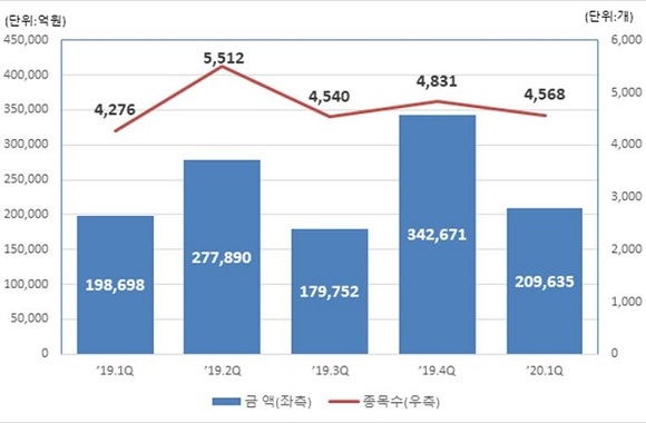 공모 발행금액은 직전분기 대비 42.2%(13조 3834억원) 감소한 반면 사모 발행금액은 직전분기 대비 3.1%(798억원) 증가세를 보였다.