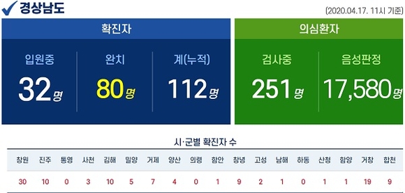 경남도는 17일 오전 코로나19 대응 브리핑에서 창원 거주 남성(22·경남 115번)이 양성 판정을 받았다고 밝혔다.
