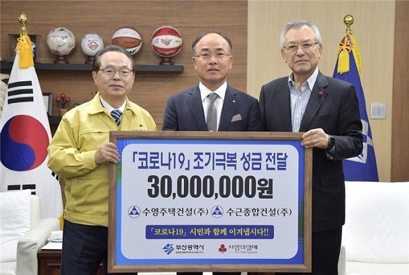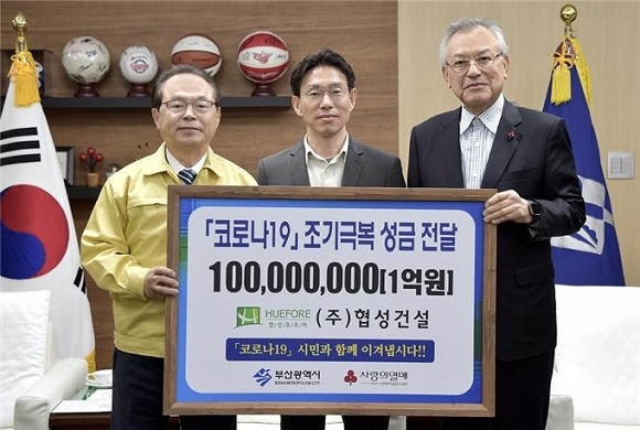 이날 협성건설은 성금으로 1억원을, 수근종합건설은 3000만원을 부산시에 전달했다. 전달된 기부금은 부산사회복지공동모금회를 통해 코로나19로 어려운 소상공인과 의료진, 취약계층 등에 쓰일 예정이다.