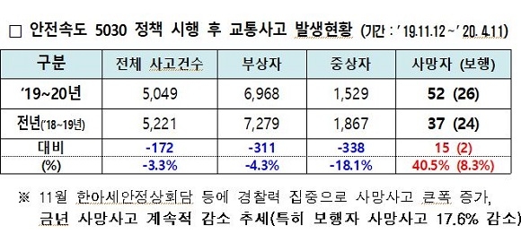 또 안전속도 5030 정책 시행 이후 교통사고 발생 현황을 보면 전년동기 대비 전체 사고 건수와 부상자 수는 줄어들었으며 교통사고 사망자 수는 늘어났다. 이에 경찰은 단속 카메라 운영 필요성을 강조했다.