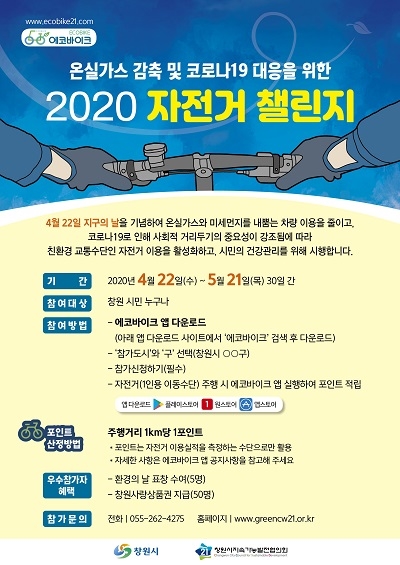 경남 창원시는 창원시지속가능발전협의회와 함께 지구의 날 50주년을 맞아 '온실가스 감축 및 코로나19 대응을 위한 2020 자전거 챌린지'를 22일부터 5월 21일까지 한 달간 진행한다고 밝혔다.