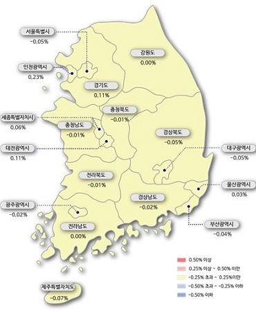 세부적으로 수도권 중 서울은 0.05% 하락한 반면 인천은 0.23% 상승, 경기는 0.11% 상승했다. 지방의 경우 5대 광역시는 0.01% 하락했으며 기타 8개 도는 0.02% 하락한 반면 세종시는 0.06% 상승했다.