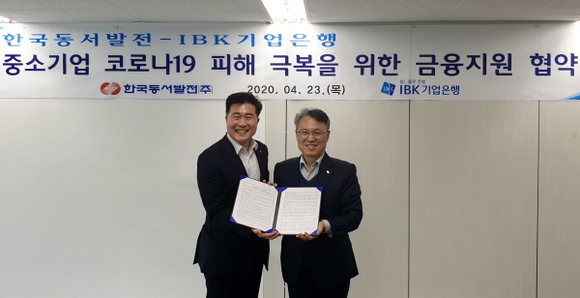 한국동서발전은 23일 오후 2시 서울 소재의 발전공기업협력본부에서 IBK기업은행과 ‘중소기업의 코로나19 피해 극복을 위한 금융지원 협약’을 체결했다고 밝혔다.