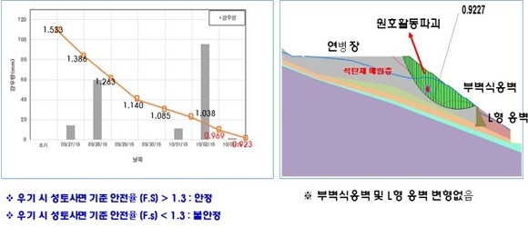 대한토목학회 부울경지회는 복구에 앞서 응급방안으로 강우 시 지표수가 성토체나 원지반 내로 직접 유입돼 비탈면을 따라 흘러내리지 않도록 성토사면을 최대한 완화해 표면보호막과 하단부 옹벽 일대에 마대 설치 등을 제시했다.