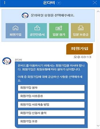 온비드 고객이 ‘온다비’에 질문 유형이나 키워드를 입력하면 회원가입 절차, 입찰 참가방법 등의 다양한 정보를 제공해준다. 또 온다비는 음성인식 기능도 탑재해 고령층 등의 서비스 이용을 도울 예정이다.