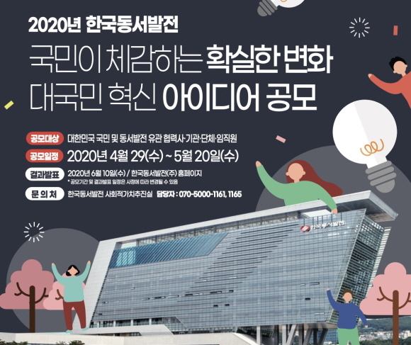 한국동서발전은 국민이 체감하고 공감할 수 있는 혁신활동을 추진하기 위해 ‘2020년 대국민 혁신 아이디어 공모’를 실시한다고 6일 밝혔다.
