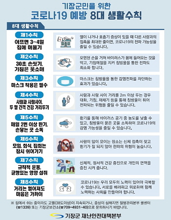 기장군의 8대 생활수칙은 ▲아프면 3~4일 집에 머물기 ▲30초 손 씻기, 기침은 옷소매로 ▲마스크 착용 필수 ▲사람과 사람 사이 두 팔 간격 ‘건강거리’ ▲매일 2번 이상 환기, 손 닿는 곳 소독 ▲모임, 회식, 집회는 잠시 쉬어가기 ▲규칙적 운동과 균형 있는 영양 섭취 ▲거리는 멀어져도 마음은 가까이다.