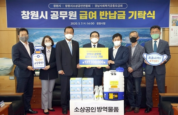 경남 창원시는 7일 지역 소상공인 코로나19 극복 지원을 위해 창원시-창원시 소상공인연합회-경남사회복지공동모금회가 함께 모인 자리에서 '창원시 공무원 급여 반납금 기탁식'을 가졌다.