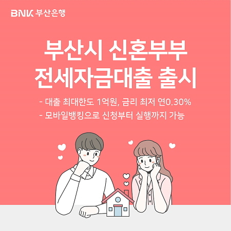 BNK부산은행이 오는 11일 부산에 거주하는 신혼부부를 위한 초저금리 전세자금대출을 신규 출시한다고 8일 공고했다.