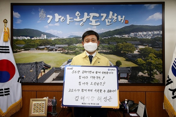 코로나19 극복 희망릴레이에서 허 시장은 '56만 김해시민과 함께 응원합니다. 힘내라 대한민국! 힘내라 소상공인! 코로나19 함께 하면 극복할 수 있습니다'라는 희망 메시지를 전했다.