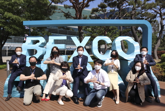 벡스코 이태식 대표(왼쪽 다섯 번째)를 비롯한 벡스코 임직원들이 11일 ‘덕분에 챌린지’에 동참해 존경을 뜻하는 수어 자세를 취하며 기념촬영하고 있다. 덕분에 챌린지는 코로나19 감염병 극복을 위해 헌신하고 있는 의료진에 감사와 응원의 메시지를 전달하는 온라인 릴레이식 캠페인이다. (사진=벡스코 제공)