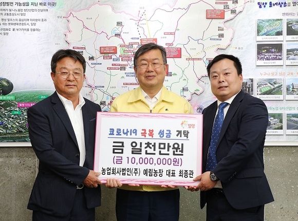 농업회사법인(주) 예림농장은 11일 밀양시청을 방문해 코로나 극복에 써달라며 성금 1000만원을 기탁했다.