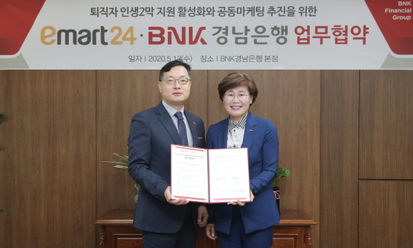 BNK경남은행은 13일 이마트24와 ‘퇴직자 창업지원 업무협약’을 체결했다. 이날 WM고객본부 이정원 상무는 경남은행 본점을 방문한 이마트24 강인석 상무와 ‘퇴직자 창업지원 업무 협약식’을 가졌다.