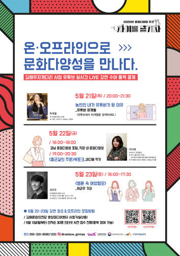 (재)김해문화재단은 오는 21일부터 23일까지 문화다양성 주간 행사의 일환으로 ‘경남 문화다양성 포럼’ 및 ‘함께 가치-온라인 강연’을 진행한다.