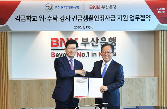 BNK부산은행이 13일 오후 은행 본점에서 부산시교육청과 ‘각급 학교 위·수탁 강사 긴급생활안정자금 지원’ 업무협약을 체결했다고 밝혔다.
