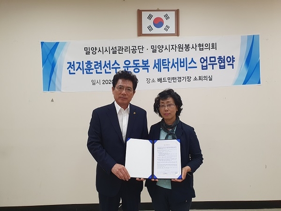 밀양시시설관리공단과 (사)밀양시자원봉사단체협의회는 13일 배드민턴경기장 전지훈련 활성화를 위해 운동복 세탁 서비스 업무협약을 체결했다.