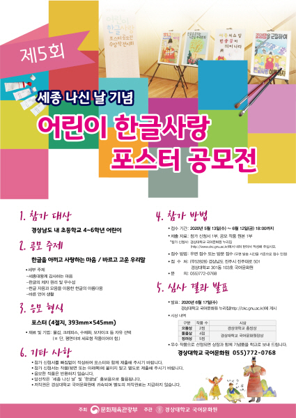 국립 경상대학교(GNU) 국어문화원은 제623돌 세종 나신 날(5.15)을 맞이해 ‘2020 제5회 어린이 한글 사랑 포스터 공모전’을 개최한다.
