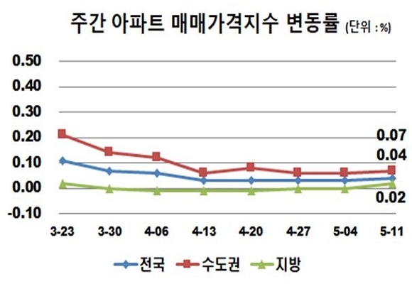 지방은 지난주 0.02% 상승에서 이번주 0.03% 상승으로 상승폭이 소폭 올랐다. 또 5대 광역시도 전주 0.02%에서 이번주 0.04%로 상승폭이 소폭 올랐다.