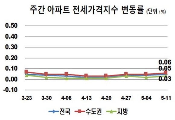 5월 1주차 아파트 전세가는 전주대비 0.05% 상승하며 지난주 상승폭 0.04%에 비해 소폭 상승했다. 수도권의 상승폭도 0.06% 상승하며 지난주 상승폭인 0.05%에 비해 소폭 상승했으며 서울은 지난주 0.02% 상승폭에서 이번주 0.02%로 상승폭을 유지했다.