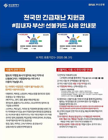 또 ‘#힘내자 부산!’ 선불카드 방문 신청도 시작된다. 선불카드는 세대주 출생연도 끝자리에 따라 5부제 요일에 주소지 관할 읍·면·동 주민센터를 방문해 신청하면 된다.