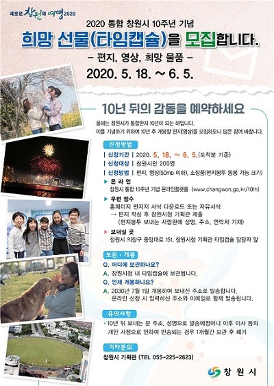 온라인 신청은 통합 10주년 기념 온라인플랫폼 행사참여 코너에서, 우편으로는 창원시청 기획관 타임캡슐 담당자 앞으로 보내면 된다.