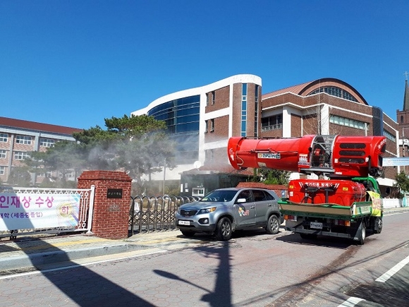 시는 학생들이 안전하게 등교할 수 있도록 농업용 광역방제기 2대를 동원해 관내 초·중·고교 운동장과 주변 일대를 집중 소독하고 있으며, 향후 코로나 진행상황에 따라 매주 일요일 방역할 계획이다.