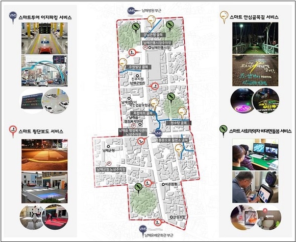 또한 '보물섬 남해 오시다' 남해 도시재생사업지 내에는 △관광친화 도시의 랜드마크를 부각시키고, 찾아오는 관광객은 물론 지역주민들의 주차난을 해소코자 대형 VMS(도로전광판)과 스마트시티 통합플랫폼과 연계한 시스템을 통해 보다 쉽고 편리한 이지파킹(Easy Parking)을 제공하고, △지역기상청과 경찰서와 협업해 보다 안전한 스마트 횡단보도 서비스 △무비라이트(원격 이미지 전송) 등을 갖춘 보다 안전한 스마트 안심골목과 △사회적 약자를 위한 화상영상 비대면 돌봄서비스 시설들이 들어서게 된다.