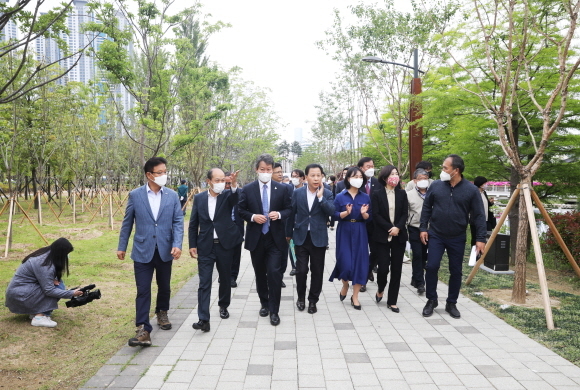 부산시민공원에 ‘농협 기부숲’이 준공되며 21일 오전 11시 준공식이 열린 가운데 변성완 시장 권한대행(왼쪽 세 번째), 추연길 부산시설공단 이사장(맨 왼쪽) 등이 숲을 걸으며 시설 점검을 하고 있다.