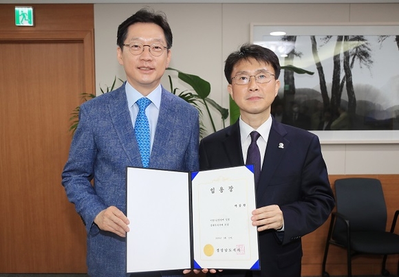 경남도 신임 경제부지사에 박종원(오른쪽) 전 산업통상자원부 중견기업정책관이 22일 취임했다. 현재 코로나19에 따른 도내 상황을 고려해 별도의 취임식은 개최하지 않았으며, 오전 충혼탑 참배 후 11시 30분경, 김경수 도지사에게 임용신고를 했다. (사진=경남도 제공)