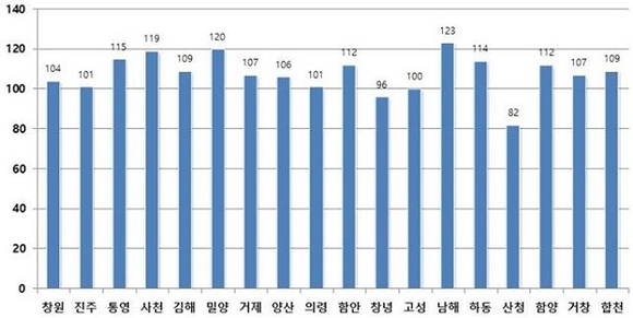 지역별로는 창녕군과 산청군을 제외한 16개 시군이 전년 동기 대비 매출액이 증가한 것으로 나타났으며, 가장 많이 증가한 지역은 남해군(123%), 밀양시(120%), 사천시(119%) 순이다.