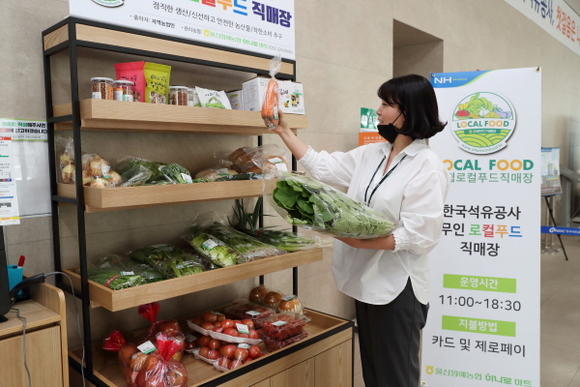 한국석유공사는 코로나19로 인해 농산물 판매나 매출감소 등의 어려움을 겪고 있는 지역 농가를 돕기 위해 울산 중구 본사 1층 로비에 무인 로컬푸드 직매장을 통해 지역 농산물 소비 촉진에 나서고 있다.