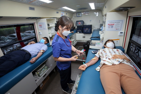 이날 본부 부서 임직원 50여 명은 체온 측정과 손 소독을 마친 뒤 본점 주차장에 자리잡은 헌혈버스에 올라 헌혈을 했다. 특히 건강 상태와 헌혈 2주 경과 여부를 따져 전혈 및 성분 헌혈에 나섰다.
