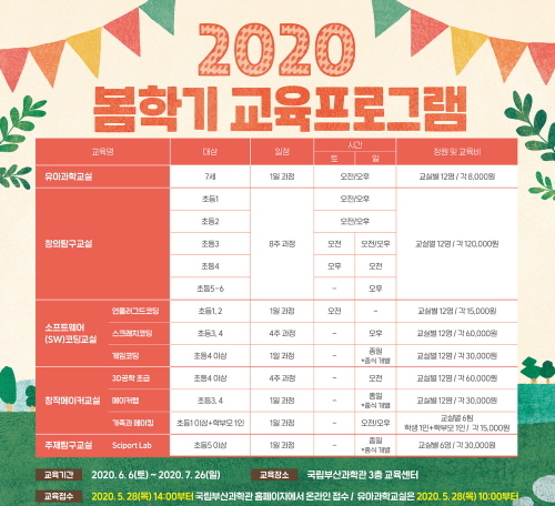 봄학기 교육프로그램은 유아과학교실, 창의탐구교실, 소프트웨어 코딩교실, 창작메이커교실, 주제탐구교실 등 5개 분야로 나눠 진행된다.