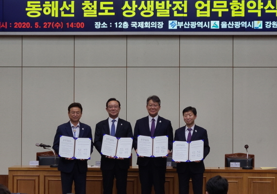 부산시와 울산시, 경북도, 강원도 4개 광역지방자치단체가 27일 오후 2시 부산시청 12층 국제회의장에서 ‘동해선 철도 상생발전 업무협약’을 맺었다.