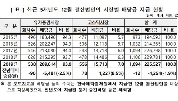 예탁결제원이 배포한 자료에 따르면 지난 연말 배당금 총액은 전년대비 4254억원(1.9%) 감소한 22조 5527억원으로 나타났다.