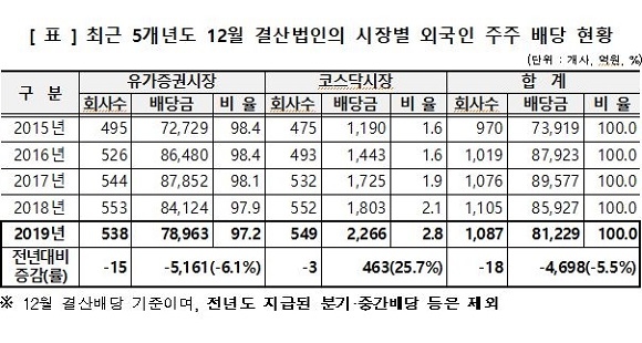 외국인 주주의 배당금은 총 1087개사에서 지급해 전년대비 18개사가 감소했다. 배당금은 전년대비 4698억원(5.5%) 감소한 8조 1229억원으로 나타났다.