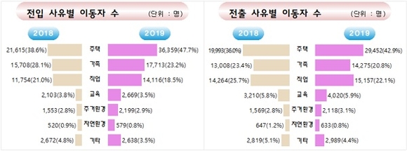 주요 이동사유는 주택, 가족, 직업 등으로 지난해 전입 사유 중 주택이 47.7%, 가족 23.2%, 직업 18.5% 순으로 나타났고, 전출은 주택 42.9%, 직업 22.1%, 가족 20.8% 순으로 전출입 모두 주택이 가장 큰 이동의 원인이었다.