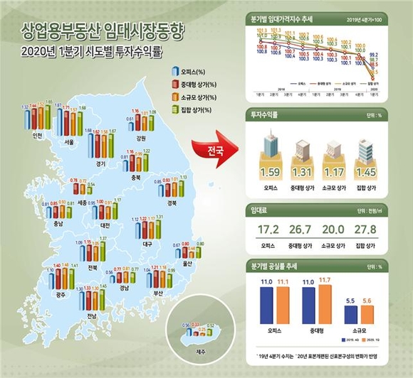 한국감정원은 27일 ‘2020년도 1분기 전국 상업용 부동산 임대시장 동향’을 조사한 결과를 발표했다.