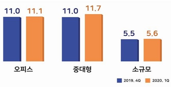자산가치 변동을 나타내는 자본수익률은 오피스 0.53%, 중대형 상가 0.35%, 소규모 상가 0.31%, 집합 상가 0.31%로 나타났다. 공실률의 경우 전국 평균으로 오피스의 경우 11.1%, 중대형 상가는 11.7%, 소규모 상가는 5.6%로 나타났다.