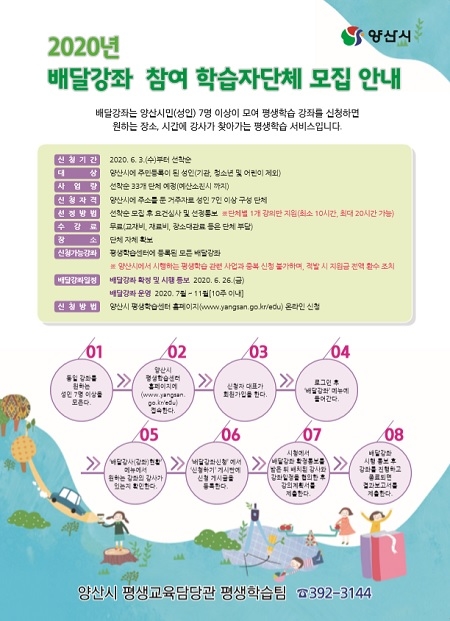 배달강좌 신청은 양산시 평생학습 센터를 통해 6월 3일부터 선착순 30여팀을 모집하고, 최대 20시간까지 신청 가능하다. 배달강좌의 내용은 양산시 평생학습센터 홈페이지를 통해 확인 가능하며, 기업으로 찾아가는 평생교육 역시 배달강좌 내용을 확인 후 홈페이지에서 신청서 다운받아 신청 가능하다.