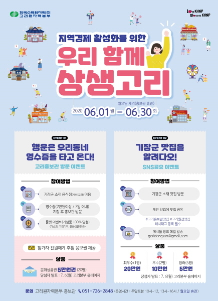 한국수력원자력 고리원자력본부는 내달 1일부터 코로나19 사태 장기화로 얼어붙은 지역 경제를 활성화하기 위해 ‘우리 함께 상생고리’ 이벤트를 실시한다. 이벤트는 오프라인과 온라인에서 6월 한 달간 동시에 진행한다.